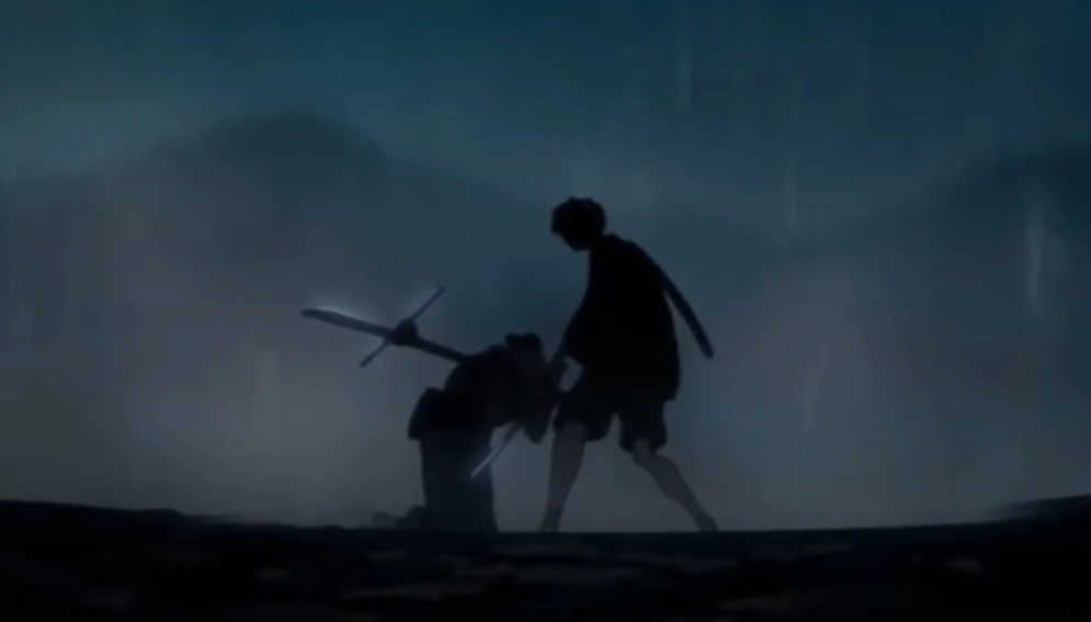 Mugen eventually locates Sara and their rematch commences, but it ends almost as quickly as it begins. Mugen, heeding Jin’s wisdom, attempts to use the rainy weather conditions in his favor and flow with their movements, which allows him to get it one lethal blow against Sara who oddly chooses to pull back on her weapon just as it’s about to make contact with Mugen. As she lays on the ground, Mugen wonders why she chose not to follow through with her attack. She confesses with the knowledge that her son’s likely been dead this whole time, and she allowed herself to be manipulated by whoever it was that hired her. After saying her parting words to Mugen, she dies right there, and the episode ends with Mugen tossing her blade in a fit of rage.
