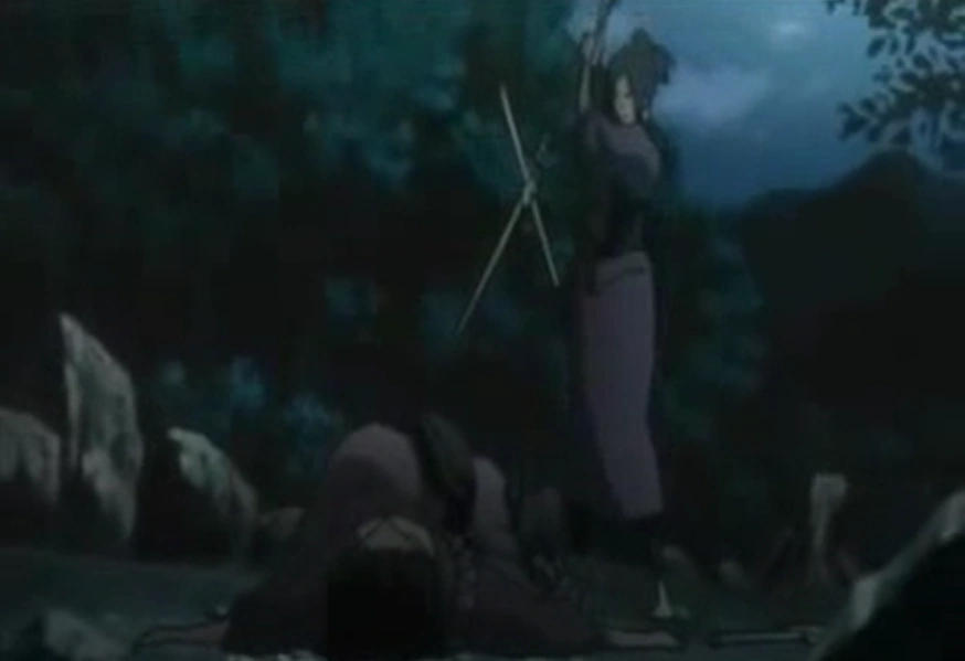 He makes an offhand comment suggesting he knows of Sara’s true nature, causing her to challenge him to a fight by the river. Nightfall arrives as Mugen and Sara begin their battle, and as it goes on it becomes clear that Sara has the upper hand, stabbing and slicing Mugen a handful of times.