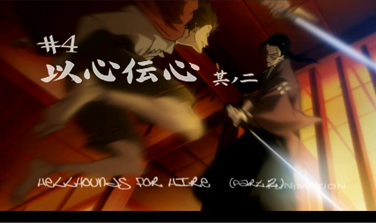 Hellhounds for Hire (Part 2) (以心伝心 其之弐, Ishindenshin sono ni) is the fourth episode of Samurai Champloo. It originally aired June 17, 2004 and aired June 4, 2005 in the US.