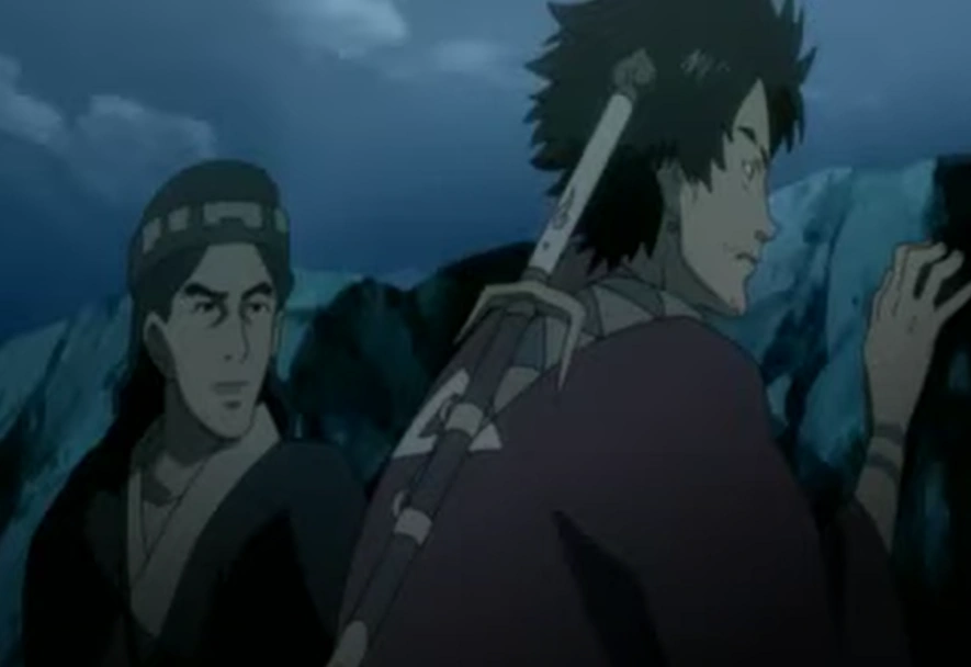 Mugen, enraged, attacks them for interfering with his fight, and Jin eventually makes his presence known to provide assistance. Okuru, still alive somehow, takes one of the flaming arrows and kills one of the attackers as he stumbles to the edge of the nearby cliff. Our heroes look on as he hurls himself off the edge, never to be seen again.