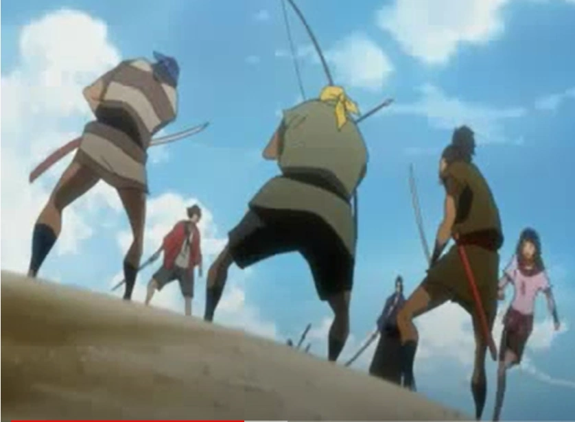 Koza is upset at the prospect of Mugen leaving again, having always preferred his presence over the company of Mukuro. Afterwards, Jin and Fuu head off to wander around, coming across an oddly desolate village while Mugen has another encounter with Mukuro, reminding him of his past. Cut to a flashback of Mugen standing on cliff about to be executed by a firing squad (for an unknown crime), making his escape by jumping off the cliff before a single shot is fired (it is implied that Mugen survives the fall, and meets Jin and Fuu soon after).