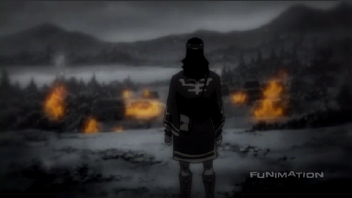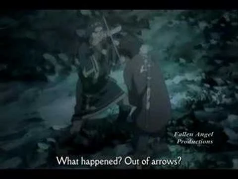 As he comes out to surrender, he speaks of the day his village died and his conflict with the Matsumae: a disease did in fact infest the village, but instead of trying to help the villagers or save them, a small set of Matsumae officials decided to burn the place down and kill everyone there, driving Okuru to murder the officials as revenge. Jin and Fuu show up in time to witness the Matsumae fire at and hit Okuru with multiple flaming arrows.
