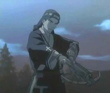 When Mugen wanders the woods on his own after an argument with Fuu, he’s unexpectedly shot at by Okuru who wields a Chu-Ko-Nu, a kind of rapid-fire crossbow originally developed in China. After dodging the assault of arrows, Mugen is asked by Okuru if he belongs to the Matsumae clan, but he doesn’t give a proper answer, forcing Okuru to leave the area before Mugen can do anything.